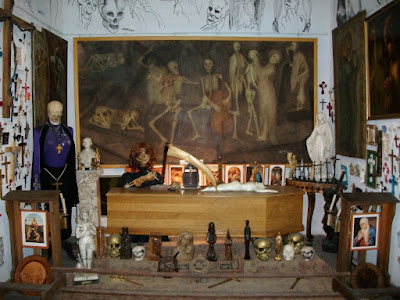The more than ten rooms are filled with a variety of objects such as the hundreds of crucifixes in the very first image, a wall completely covered with all kinds of colorful drawings and posters, as in the image above, but also a collection of ten to twelve thousand cigar bands with special images, rare musical instruments, matchboxes, African art .....